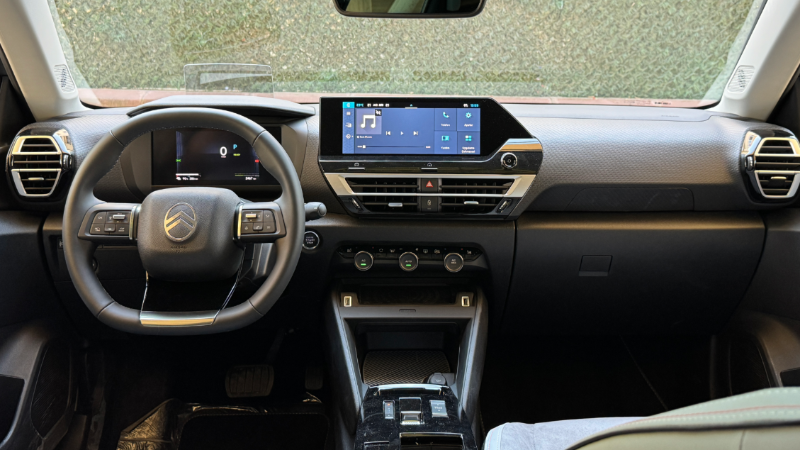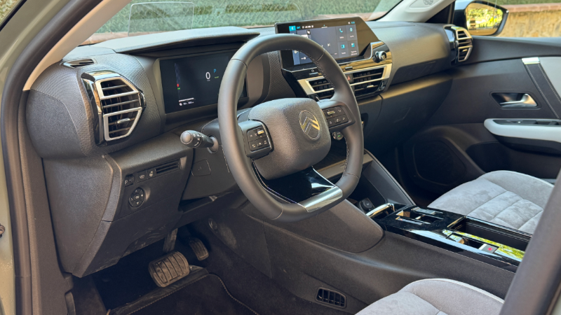 C4’ün dış tasarımı ne kadar cesursa, iç mekân o kadar mütevazı. Direksiyondaki yeni Citroën logosu, koltuklarda taze desenler ve bol bol sert plastikle karşılaşıyoruz. Ama kabin genel olarak sessiz ve iyi yalıtılmış.